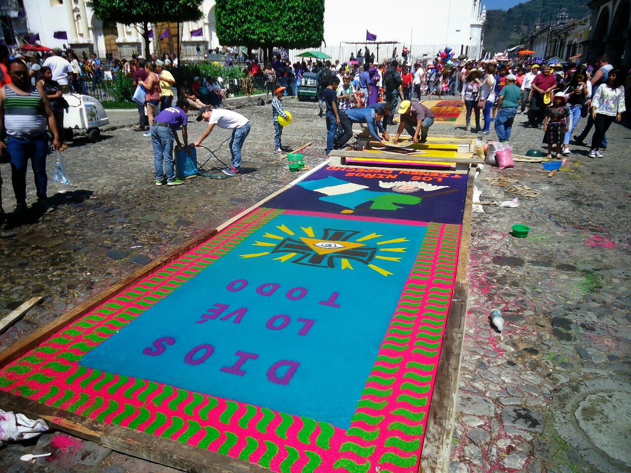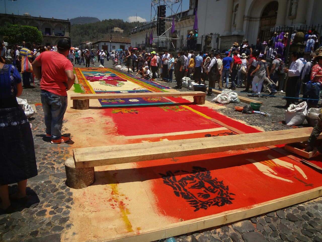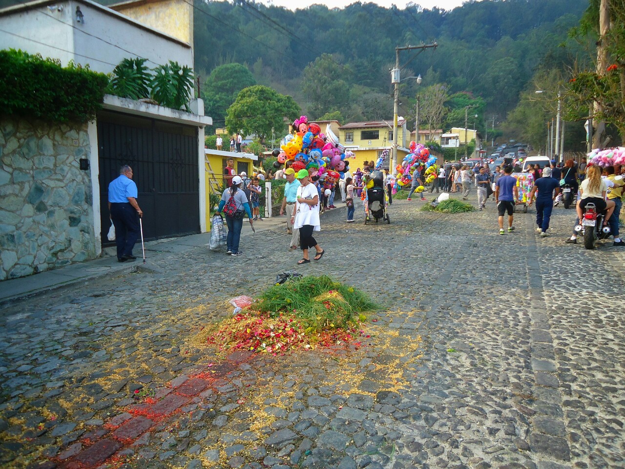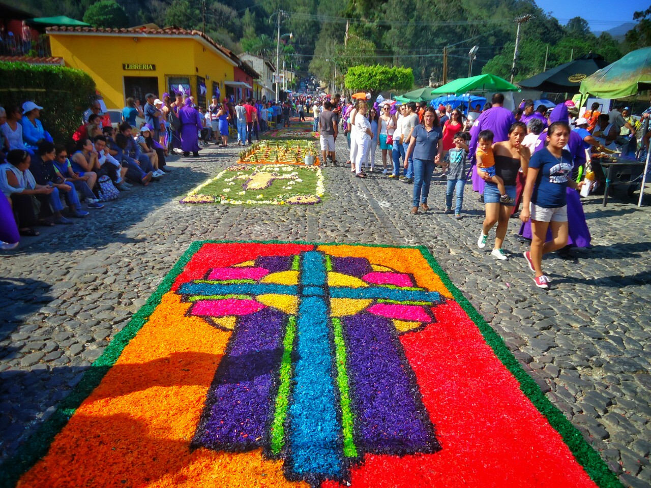 Ljudje cele dneve pripravljajo barvne vzorce po cestah, kjer bo potekalo romanje. Praznik jim očitno ogromno pomeni. Nekoliko manj so nad njim navdušeni vozniki.