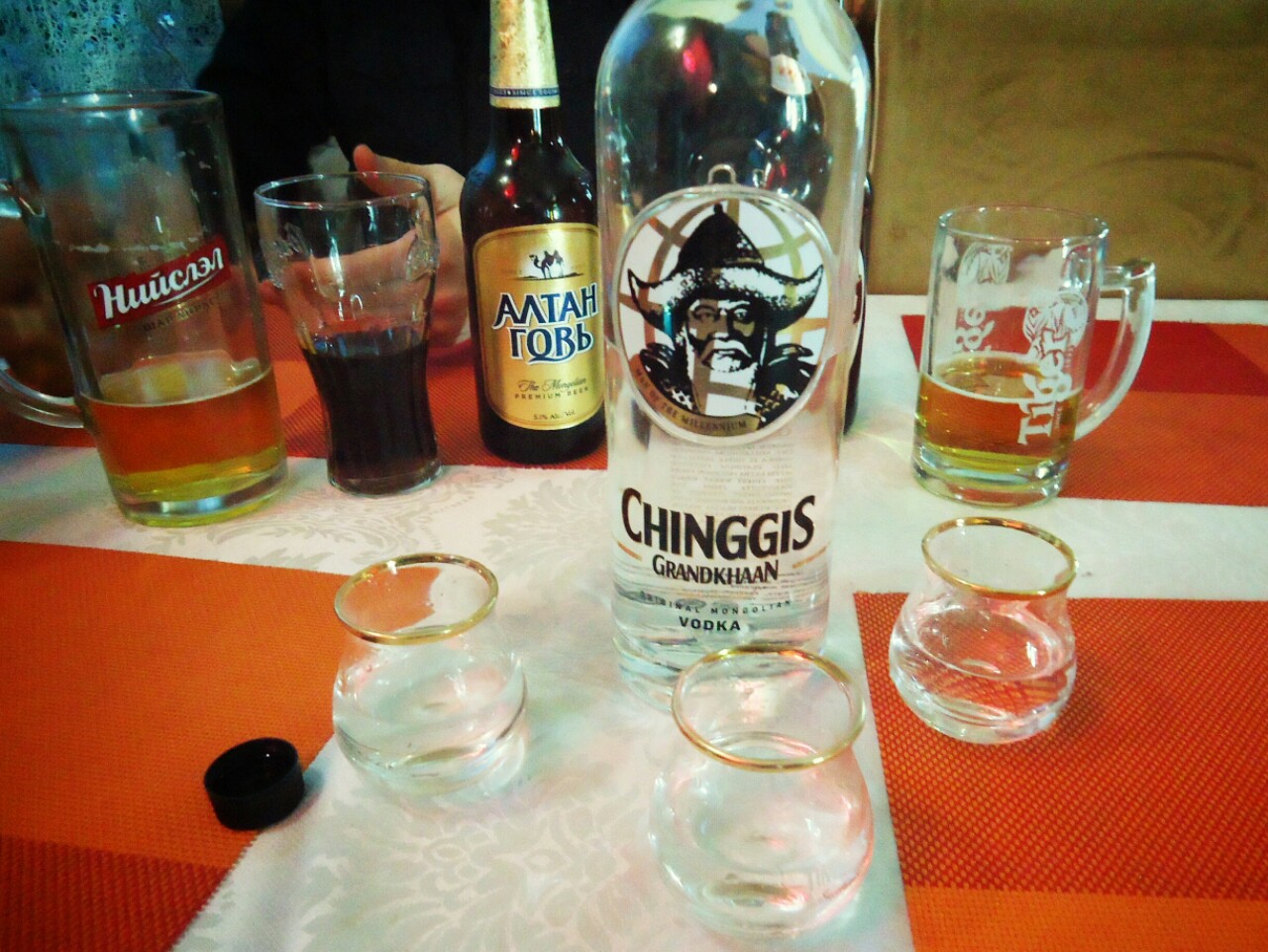 So, Ulaanbaatar - totaly western capital in the middle of completelly different surroundings. Until recent, the mongolian hero no. 1 was Sukhebaatar - the leader of comunist revolution which liberated Mongolia from China. There is a town I already mentioned that carries his name. And the main square in Ulaanbaatar was also named after him. However in 1991 Mongolia became democratic country and from then on Sukhebaatar is not so popular any more. New mongolian idol became Chinggis Khaan - great conqueror from 1000 years ago. Today he has a status of a god in Mongolia, but they look at him as the most cruel tiran in all surrounding countries. Well Sukhebaatar's square was renamed in Chinggis Khaan's. You can find vodka named Chinggis Khann, and beer, steets, pubs, hotels, even pasta... just anything you can imagine. Part of square mentioned is on the photo below left and the vodka on the right.